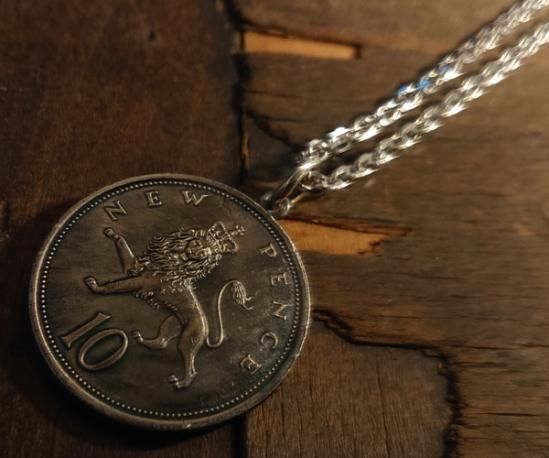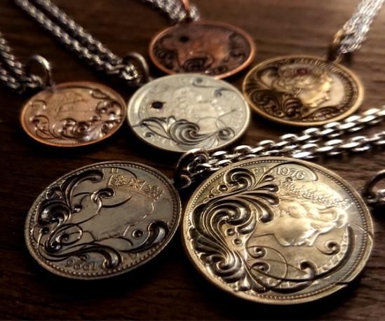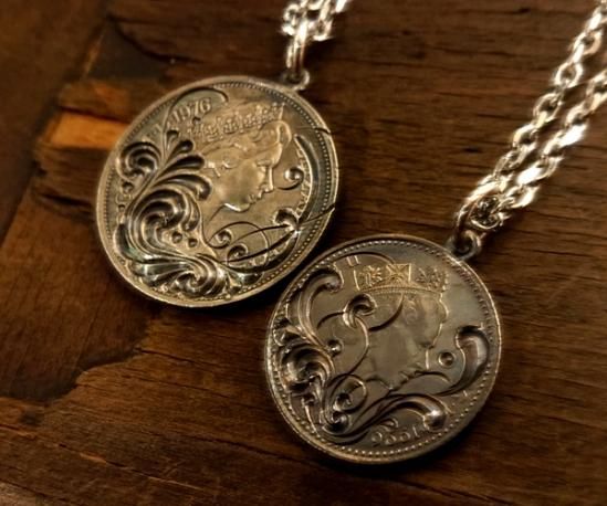 1976年製イギリスの10ペンスに一点一点手彫りで華やかなアラベスク模様で彩ったペンダントトップです。
