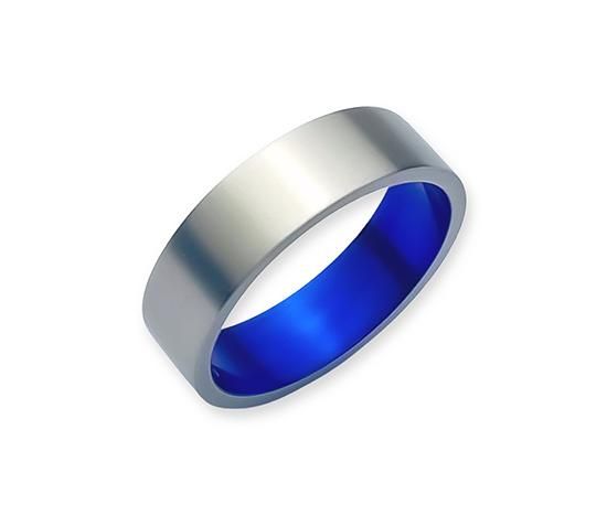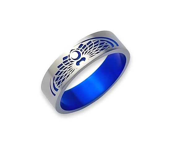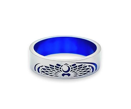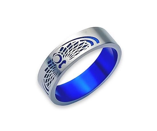 水面に浮かぶ華と三日月を彫り込んだ青色の純チタン製リングです。
