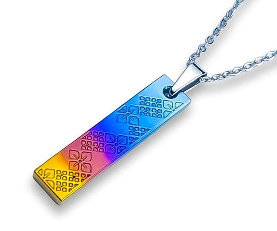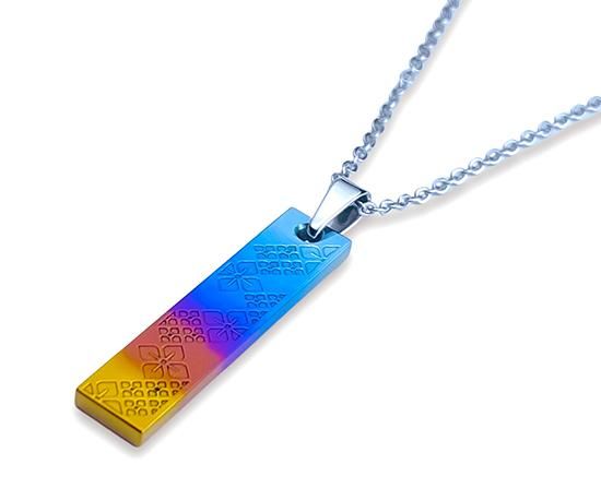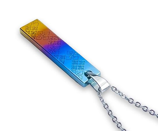 正面と側面は水色、青、紫、朱、橙の鮮やかなグラデーションカラーで、背面はチタン本来の色に仕上がっています。