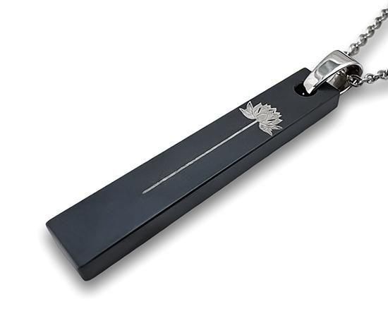 こちらは、艶を抑えたマットブラックのブラックチタンに、消し銀色の蓮華を一輪彫り込んだペンダントトップです。