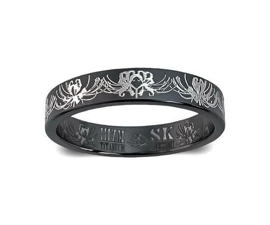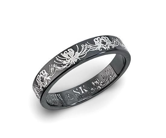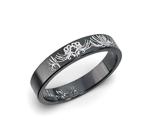 黒銀輪舞彼岸花リングは、闇夜の静けさを思わせるマットな黒の地に、消し銀色で彼岸花を描いた、落ち着いた美しさをたたえる一点です。素材には、光の加減でわずかに鈍く艶めくブラックチタンを使用し、幅は着けやすい4mm幅。