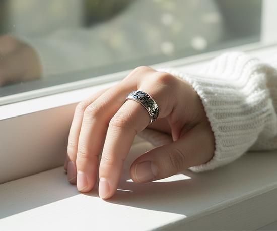 一方で、指に嵌めたときには見えない内側にも、同じく丁寧な彫刻が施されており、それはまるで「うちに咲く想い」を静かに抱くよう。