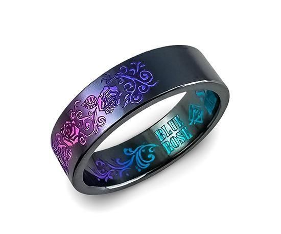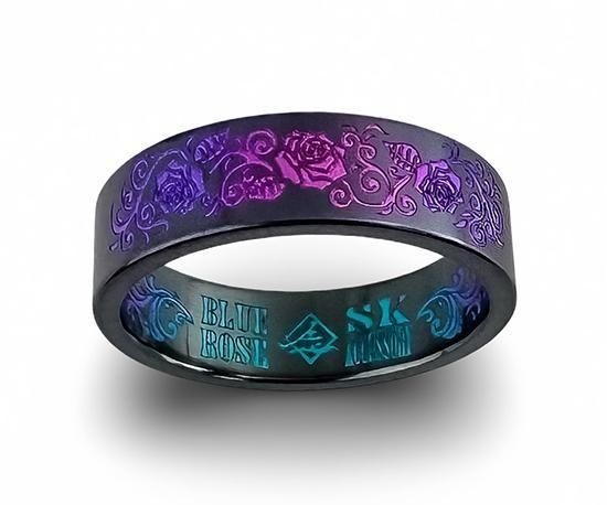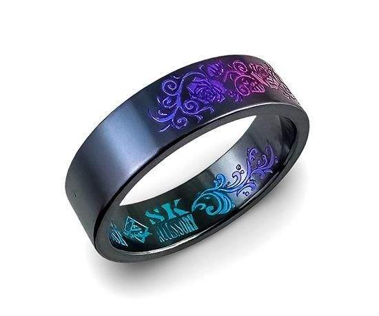 このリングは、ブラックチタンに三輪の薔薇を彫り込み、その花々に夕空のグラデーションを纏わせた一本です。